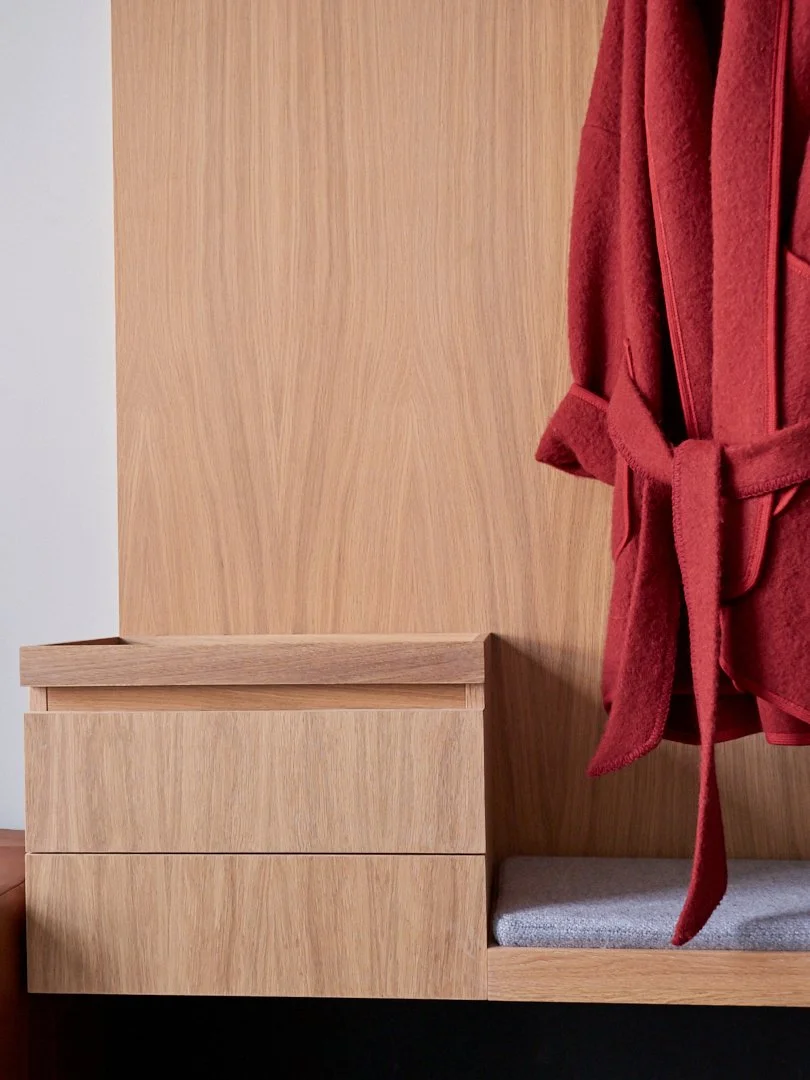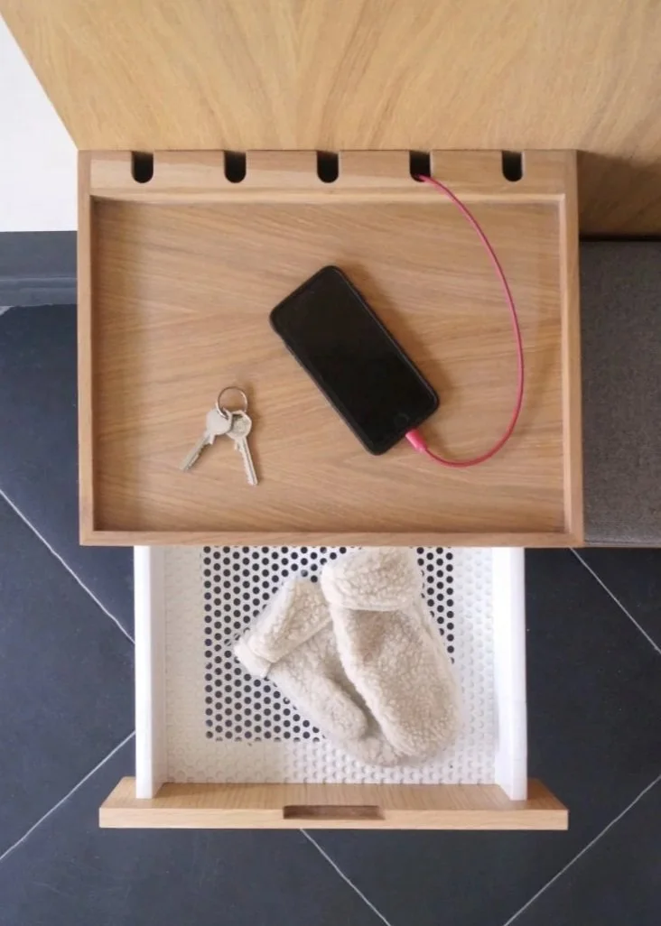 The Entré Wardrobe is a multifunctional piece that combines a coat rack, shelf, tray, bench, and drawer cabinetry in one cohesive design. The integrated tray features discreet slots for organizing charging cords. Ventilated drawers help dry damp gloves and hats, while the upper shelf provides space for accessories. The bench offers a comfortable spot for putting on shoes.