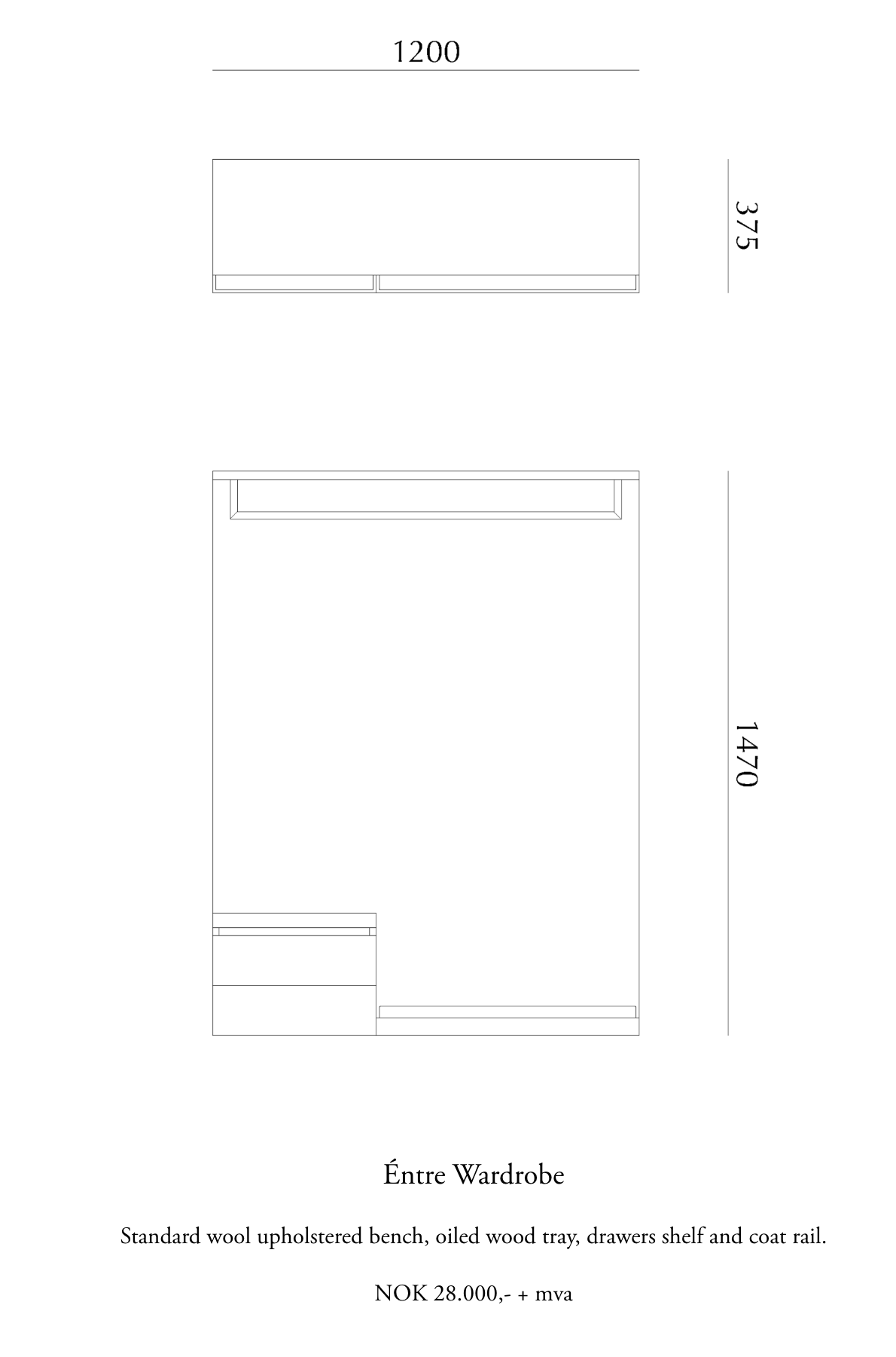 Standard wool upholstered bench, oiled wood tray, drawers, shelf and coat rail.
