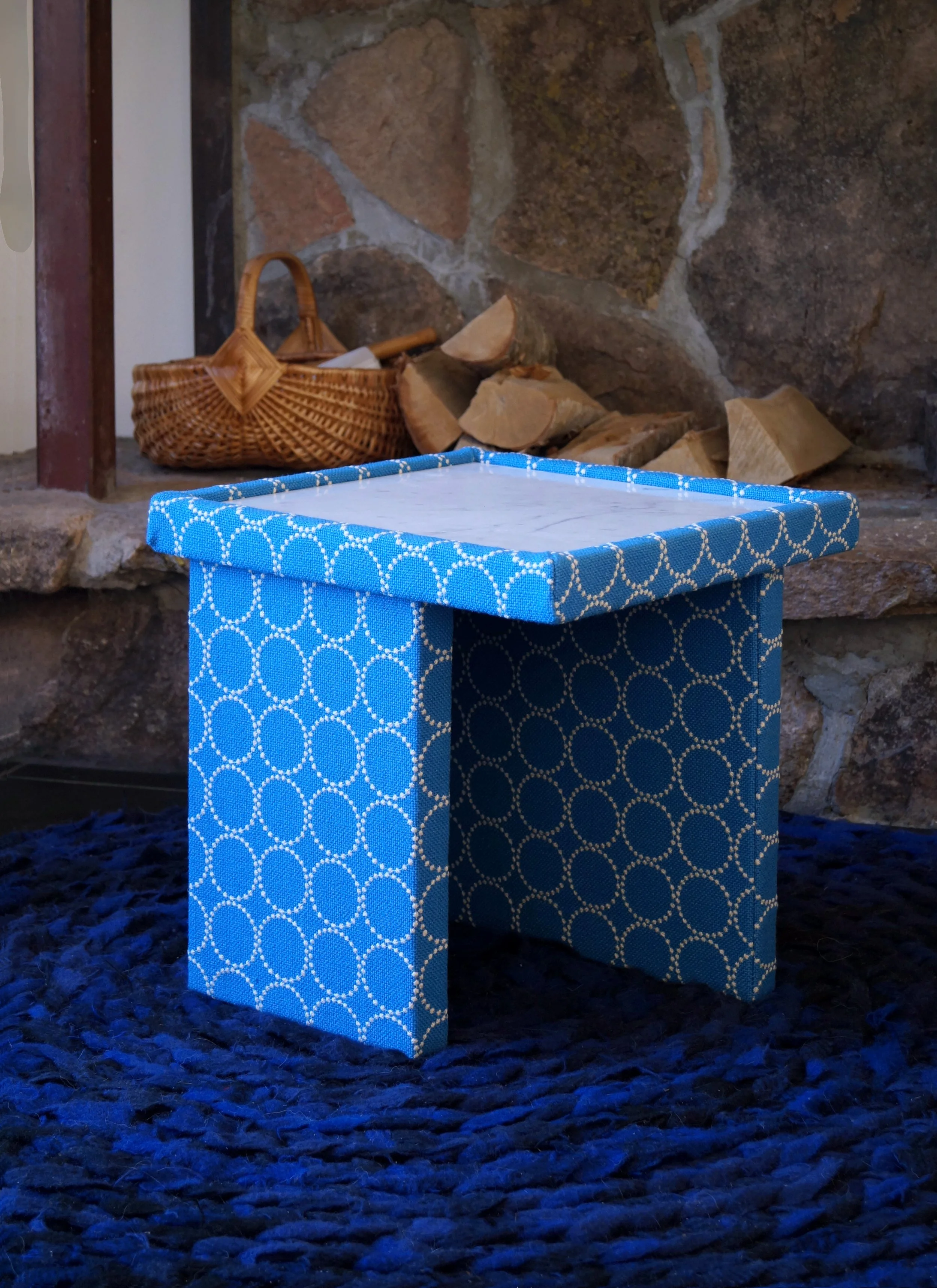 The Soft Table is designed in collaboration with Kupp Tekstil, an Oslo-based retailer for surplus upholstery fabrics. All parts, except the screws and thread, are made from surplus or reused materials. The inside can be an old cabinet door or a discarded piece of particle board, then carefully upholstered in high quality surplus upholstery fabrics. The tops are made of any suitable material we have available at the time of production, from marble to terrazzo to wood. See more pictures and a price estimate here: